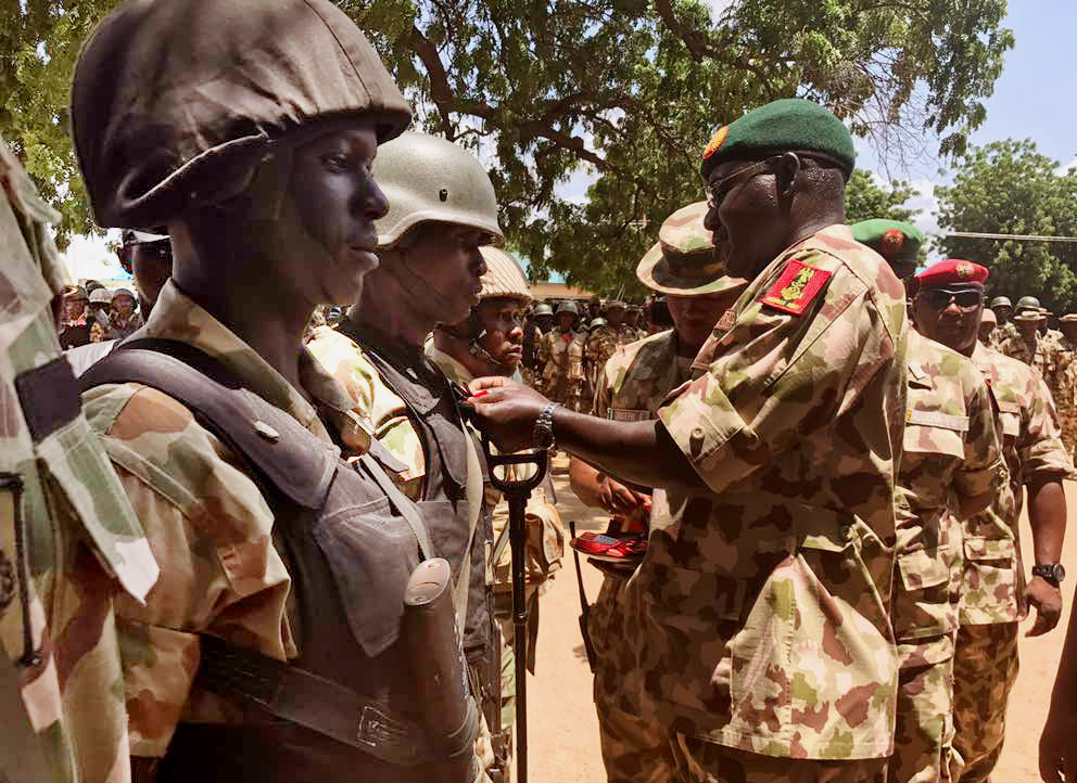 Chief of Army Staff, Lt.-Gen. Tukur Buratai decorating 65 soldiers with medals for their gallantry in the fight against Boko Haram insurgents at Bama in Borno on Wednesday Rabiu Sani/BJO/NAN